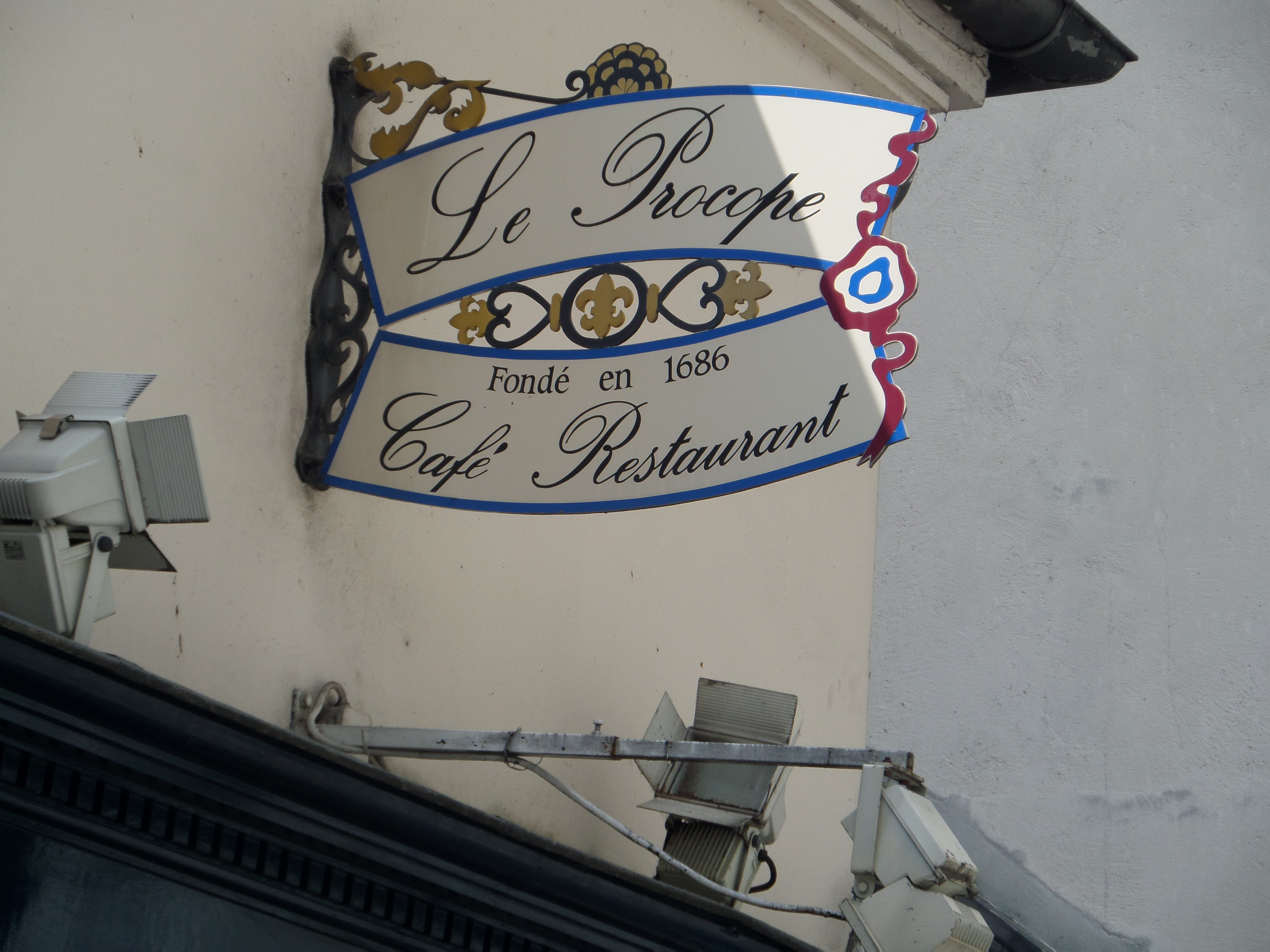 I had read about Cafe Procope before leaving Michigan and had a general idea where it was, but knew that it might be difficult to find as it wasn’t on a major street and European cities like Paris are often a maze of little lanes that you may walk right by and never recognize as a street. Street signs are not necessarily as visible as those in the states either (if they even exist). Husband and I were walking down the boulevard St. Germain (a big thoroughfare) exploring the 6th arrondissement when I had one of those “feelings” that I get when I am close to a historical find. I had the same feeling when I stumbled across the Pantheon in Rome.