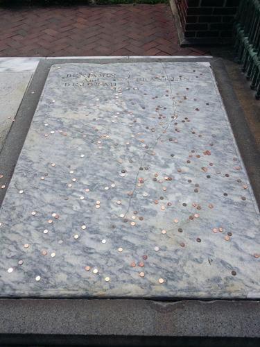 During a leisurely stroll back to the hotel, I stopped at the Christ Church Burial Ground to see Benjamin Franklin’s grave. It was very plain; no ornate tomb or ornamental decorations for Ben, just a plain slab of granite with his name inscribed. There were loads of pennies on top. Why all the pennies? Because of his saying, “a penny saved is a penny earned.” Also, I think it was probably because a bunch of $100 Ben Franklin bills would be too costly.