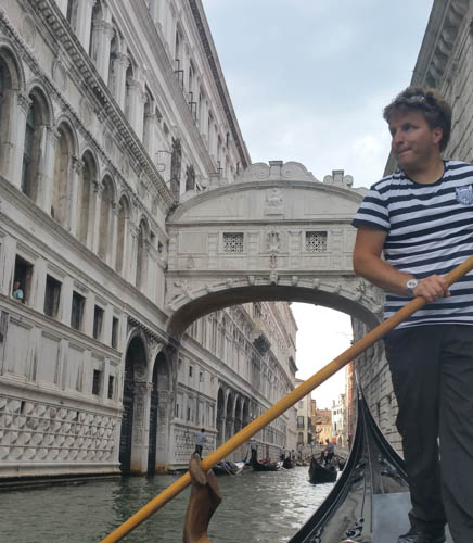 We passed the ghostly ruins of doors that once would have been magnificent entries to stately homes. Past Casanova’s house we glided. Our boat bobbed as the water ebbed and flowed. At one point we had the thrilling experience of listing severely to one side. At another time, we came to a slight traffic jam with another gondola, our gondolier deftly navigated past the other boat.