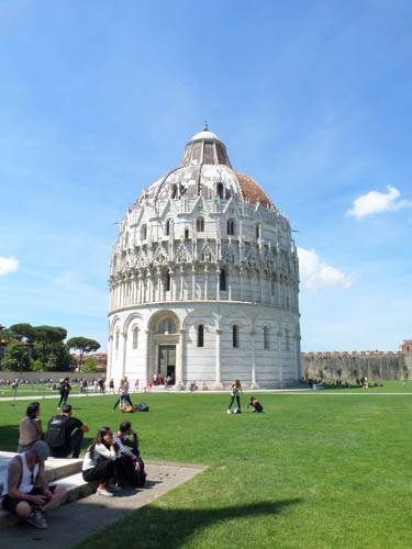 The rest of the area was equally as grand. The baptistery was an intricate masterpiece of Pisan Romanesque architecture that looked as if it was dripping in lace.